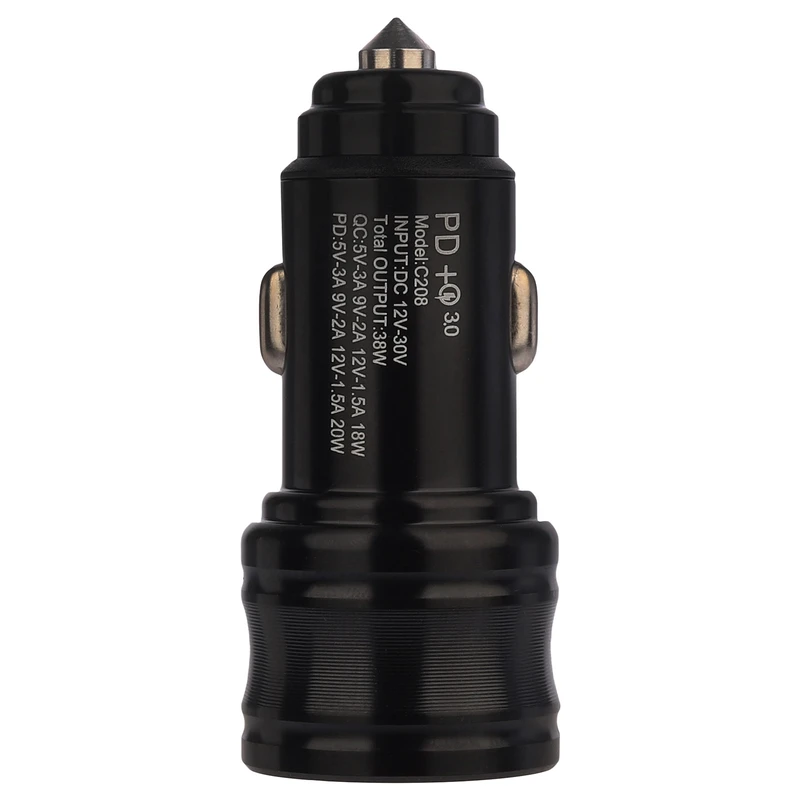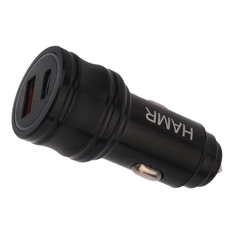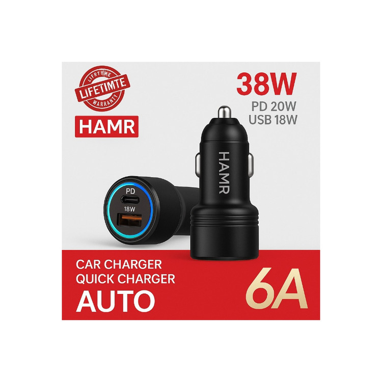 شارژر فندکی 38 وات هامر که دو پورت USB 2.0 با خروجی 18 وات و Type-C با خروجی 20 وات دارد که هر پورت تایپ سی آن از قابلیت پی دی PD بهره مند است و پورت یو اس بی آن سوپر فست شارژ میباشد. AUTO ID از اصلی ترین قابلیت آن است که برق مورد نیاز دستگاه گوشی شما را تشخیص می دهد و همان را نیز انتقال میدهد که همین سبب حفظ سلامت باتری و سریع تر شارژ شدن دستگاه می شود. بدنه این شارژر فندکی از فلز مقاوم بوده است که به آن جلا و مقاومت بخشیده است، در جعبه یک کابل USB به Type C وجود دارد. این شارژر فندکی 38 وات هامر را به هر گوشی میتوان متصل نمود و در هر ماشینی نیز قابل بهره است.
